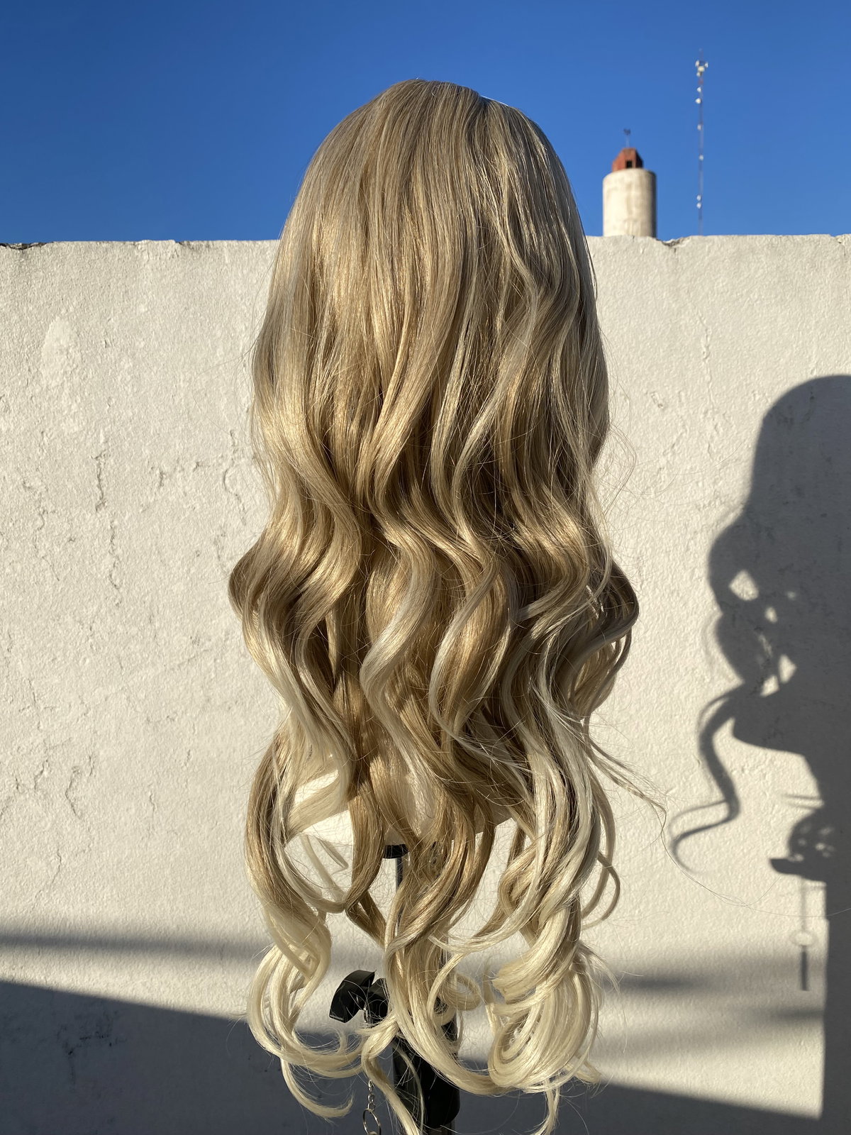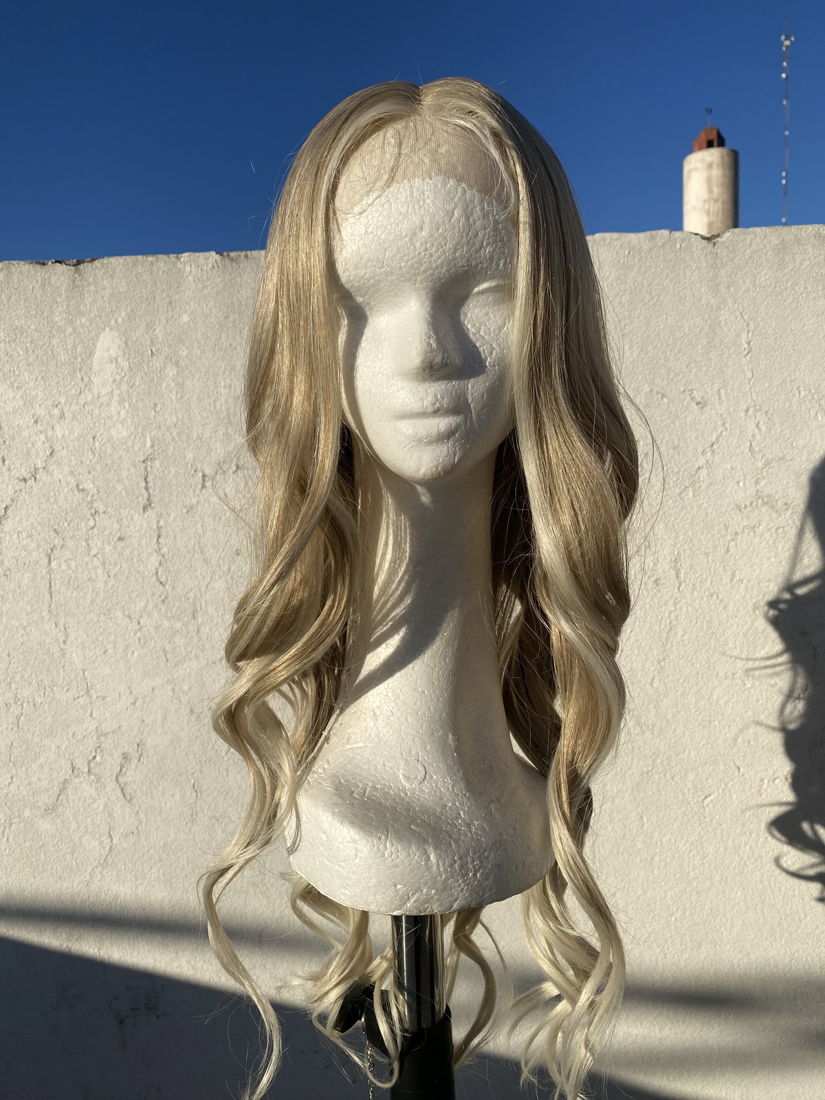 Peluca sintética termorresistente, con lace en la linea central, casco elástico y peinetas internas para un mejor agarre.
