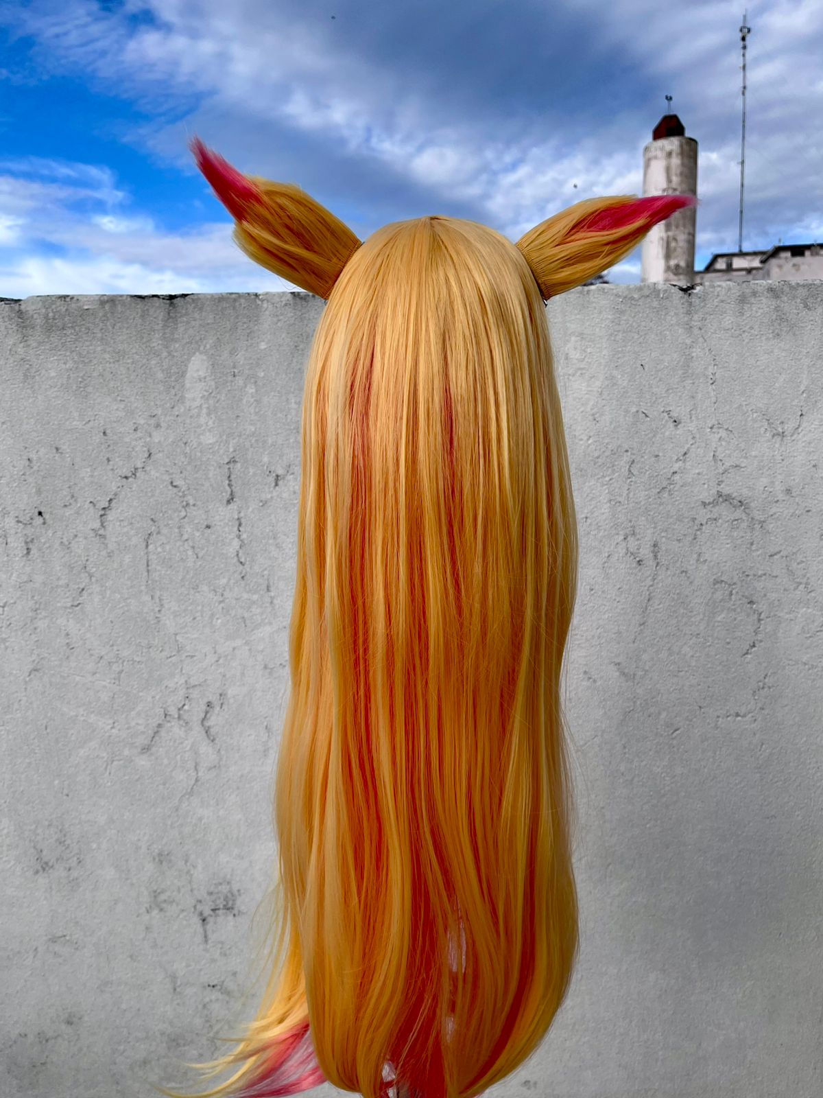 Peluca sintética termorresistente, casco elástico, mix de colores rubio con rosa con orejitas incluidas. Peluca diseñada para el personaje Ahri.